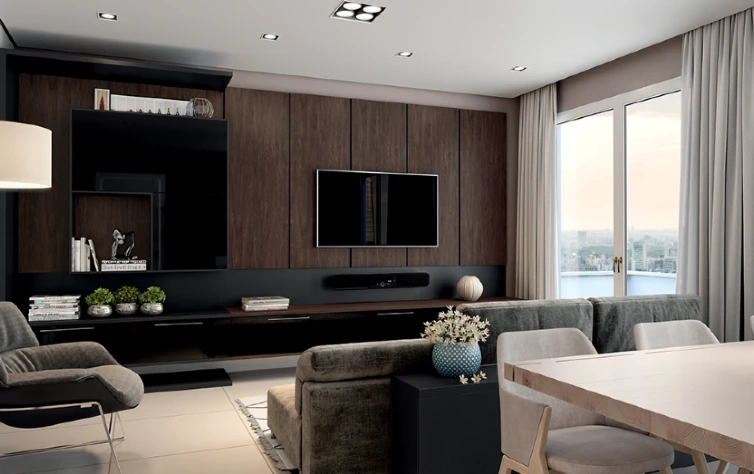 Para tornar a sala aconchegante, é bacana pensar em um aromatizador ou um arranjo de flores — mesmo simples, eles alegram o ambiente.